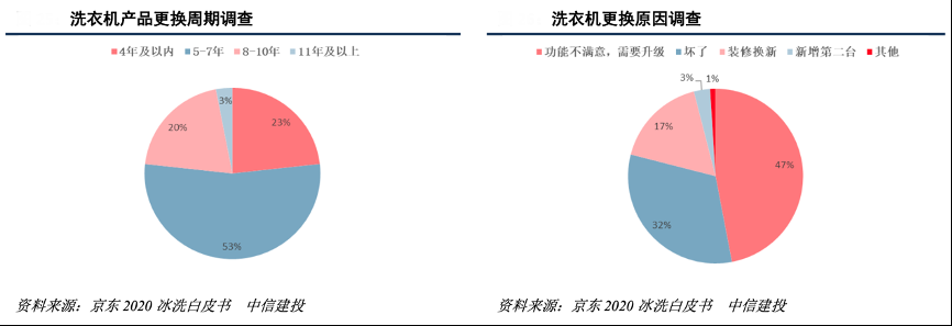 經(jīng)典案例:根據(jù)京東2020冰洗白皮書(shū)、中信建投等綜合資訊表明,冰洗產(chǎn)品消費(fèi)升級(jí)屬性凸顯,驅(qū)動(dòng)高端市場(chǎng)穩(wěn)步發(fā)展。隨著健康、品質(zhì)等消費(fèi)觀念逐漸深入人心,用戶(hù)對(duì)于冰洗產(chǎn)品消費(fèi)逐漸從“不壞不買(mǎi)”轉(zhuǎn)變?yōu)?ldquo;求新求好”,根據(jù)《京東 2020 冰洗白皮書(shū)》的調(diào)查數(shù)據(jù),目前 47% 的用戶(hù)更換洗衣機(jī)是由于對(duì)功能不滿(mǎn)意,產(chǎn)品需要升級(jí)換代,53%用戶(hù)洗衣機(jī)更換周期在 5-7 年。
