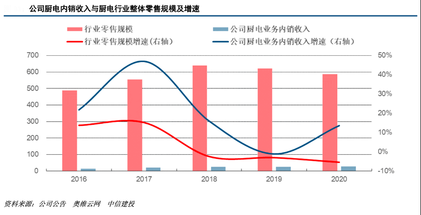經(jīng)典案例:根據(jù)公司公告、奧維云網(wǎng)、中信建投等綜合資訊表明,海爾廚電業(yè)務(wù)表現(xiàn)亮眼,2016-2017 年 公司廚電內(nèi)銷(xiāo)營(yíng)收分別大增 21.8%、47%,2018 年行業(yè)首次負(fù)增長(zhǎng)背景下海爾逆勢(shì)增長(zhǎng) 16%。2019 由于行業(yè)整 體均價(jià)下降,房地產(chǎn)市場(chǎng)回落等因素影響,其廚電內(nèi)銷(xiāo)收入出現(xiàn)小幅下滑,但在 2020 年又重拾升勢(shì)。