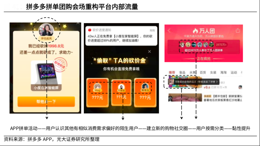 經(jīng)典案例:根據(jù)拼多多APP、光大證券研究所等綜合資訊表明,拼多多通過拼單團(tuán)購會(huì)場重構(gòu)平臺(tái)內(nèi)部流量,將原有用戶流量按需再分類,通過拼單、萬人團(tuán)等活動(dòng)引導(dǎo)用戶在購物時(shí)社交,從而形成具有相似購物需求和偏好的社交圈。拼多多用戶流量池在一定程度上自發(fā)按需分類,為拼多多的 C2M 體系打造奠定底層基礎(chǔ)。