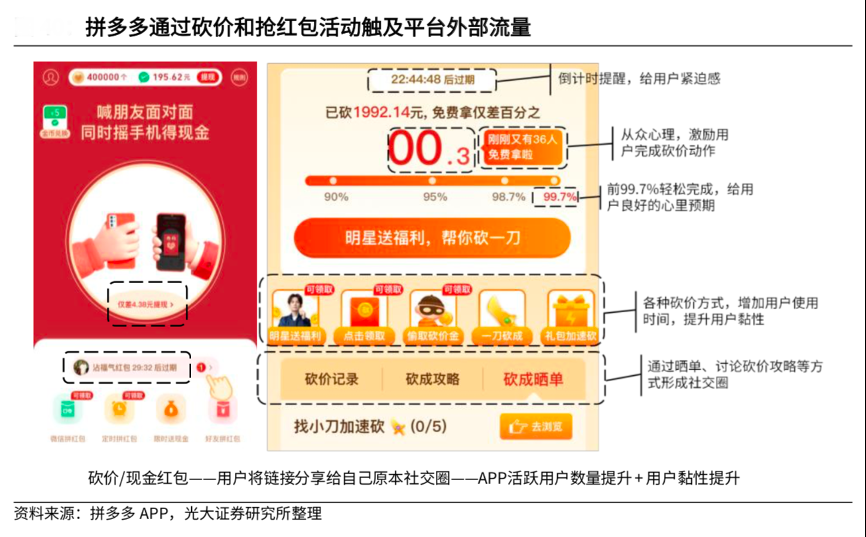 經(jīng)典案例:根據(jù)拼多多APP、光大證券研究所等綜合資訊表明,拼多多通過砍價(jià)和搶紅包活動(dòng)觸達(dá)用戶社交圈流量,引流至拼多多平臺(tái)內(nèi)。其通過推出朋友砍價(jià)和搶現(xiàn)金紅包等活動(dòng),引導(dǎo)用戶將鏈接發(fā)給朋友,獲得更多新用戶。拼多多的砍價(jià)和搶紅包的首次參與難度很低,“砍第一刀”便可以獲得大部分折價(jià),用戶形成良好的心里預(yù)期,將繼續(xù)參與砍價(jià)。