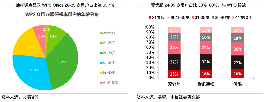 經(jīng)典案例:根據(jù)艾瑞咨詢、易觀、中信證券研究部等綜合資訊表明,結(jié)合2018 年艾瑞咨詢針對 2065 名 WPS Office 用戶做的抽樣調(diào)查顯示,WPS Office 用戶群中 26-35 歲用戶占比達(dá) 65.1%。這一年齡段屬于社會核心勞動人群,處在收入上升期,兼具提升工作效率的需求與消費能力,89 元/年的 WPS 會員以及 179 元/年的超級會員對這部分用戶構(gòu)成的消費壓力相對有限。