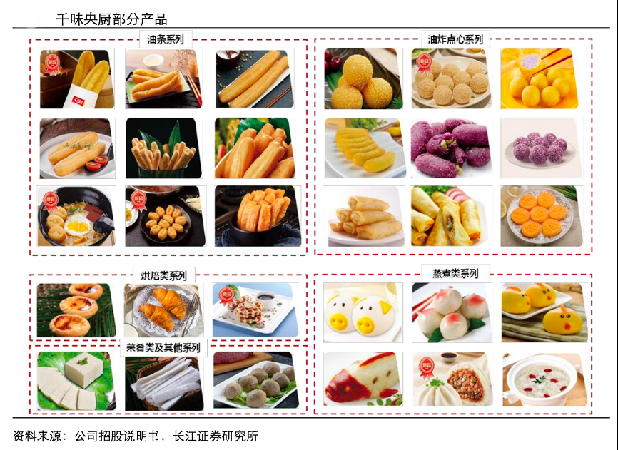 經典案例:根據公司招股說明書、長江證券研究所等綜合資訊表明,千味央廚公司產品分為油炸系列(油條系列以及油炸點心系列)、烘焙系列、蒸煮系列以及菜肴系列,單品數量達到 300+,并形成了油條類、蛋撻類、芝麻球類等含稅收入過億大單品。與家庭消費相比,餐飲業態的消費場景更為多元化。