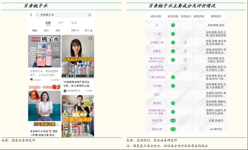 經(jīng)典案例:根據(jù)美麗修行、國金證券研究所等綜合資訊表明,貝親為日本綜合嬰童品牌,產(chǎn)品線包含嬰幼兒喂養(yǎng)用品(奶瓶、奶嘴等)、沐浴潤膚產(chǎn)品、清潔用品(衣物、奶瓶清潔劑及工具)、濕巾產(chǎn)品、孕產(chǎn)用品等。其中護(hù)膚明星產(chǎn)品為桃子水(又稱為桃葉水/桃葉精華),具有祛痱止癢、緩解紅癢等功效,為小紅書博主熱門推薦產(chǎn)品及日本代購熱門產(chǎn)品。
