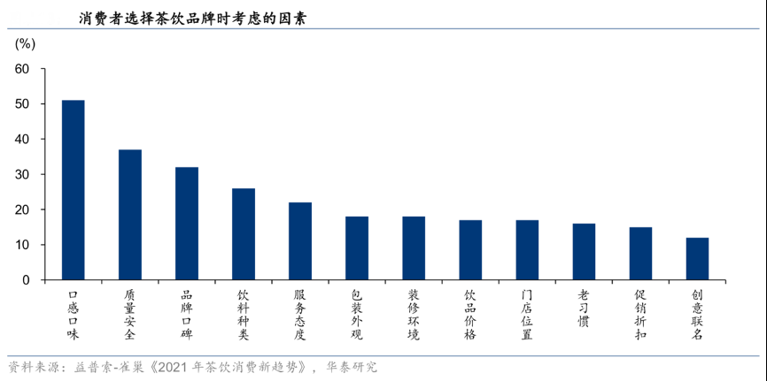 經典案例:根據益普索聯合雀巢發布的《2021 年茶飲消費新趨勢》、華泰研究等綜合資訊表明,有51/37%的消費者購買茶飲產品時將產口感口味/品質及食品安全作為考慮因素。新式茶飲采用茶葉、鮮奶、鮮果等天然優質食材為原料,引入更多配料與風味,整體品質較傳統茶飲得到提高。