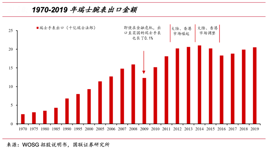經典案例:根據WOSG招股說明書、國聯證券研究所等綜合資訊表明,受益于 20 世紀 80 年代以來全球市場對高端腕表的購買熱情,瑞士出口至全球市場的腕表金額已經超過 200 億瑞士法郎(約合人民幣約 1500 億元),雖然期間遭 受多次金融危機,以及中國內地的反腐影響,但自 1996 年以來仍實現超過 5%的復合增長。