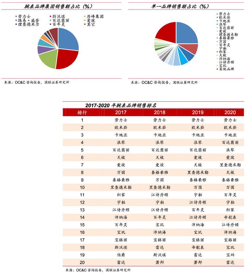 經典案例:根據OC&C咨詢報告、國聯證券研究所等綜合資訊表明,2020年 CR5 腕表品牌集團市占率高達83%,主要以瑞士品牌或者旗下控股的瑞士品牌為主,包括勞力士、斯沃琪、歷峰、路易威 登、百達翡麗等知名品牌。若進一步以單一品牌銷售額拆分,勞力士作為單一品牌占據全行業四分之一的銷售額,而 CR10 的腕表品牌市占率則高達 67%。從 2017 年至今的銷售額排名看,勞力士、歐米茄、卡地亞已經連續四年保持前三。