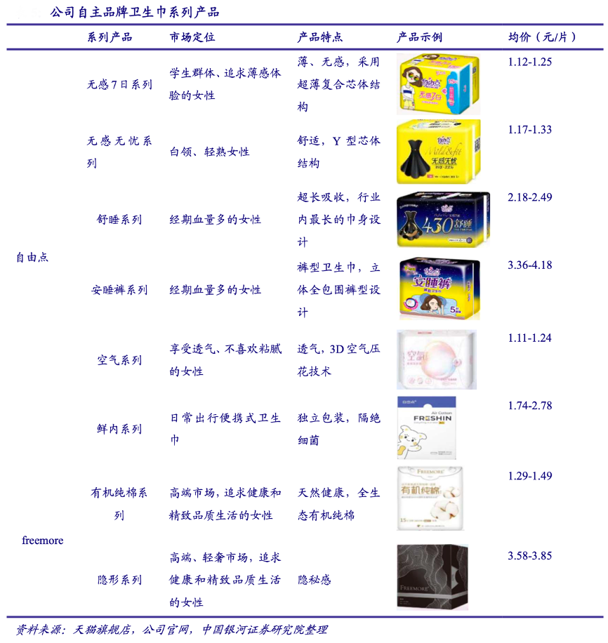 經典案例:根據天貓旗艦店、公司官網、中國銀河證券研究院等綜合資訊表明,為順應行業中高端化的消費趨勢,百亞股份公司推出定位中高端市場的衛生巾品牌“自由點”,旗下具有豐富的產品品類,基本可以滿足女性消費者群體對高品質產品以及多元化的需求。其中,無感 7 日系列和無感無憂系列產品,分別適合學生群體和輕熟白領女性的日常需求,產品具有輕薄、舒適的特點;針對追求健康和精致生活品質的女性,其推出了 freemore 有機純棉系列,選用有機純棉等高質量原材料,滿足后疫情時代消費者 對健康產品的需求。