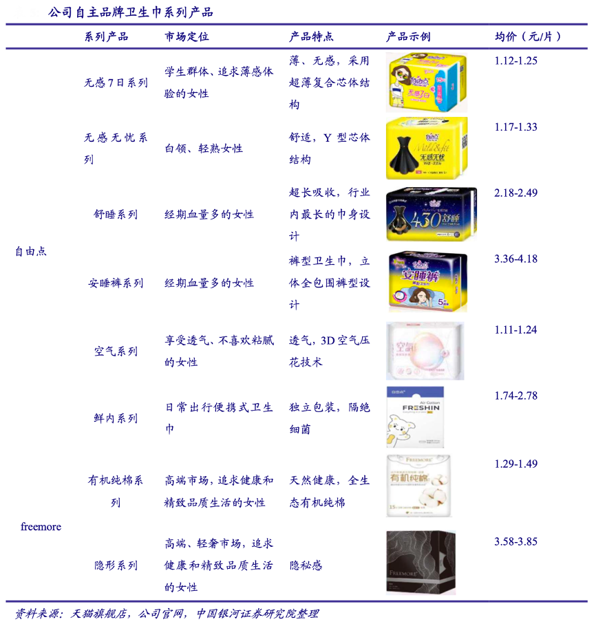 經(jīng)典案例:根據(jù)天貓旗艦店、公司官網(wǎng)、中國銀河證券研究院等綜合資訊表明,為順應(yīng)行業(yè)中高端化的消費(fèi)趨勢,百亞股份公司推出定位中高端市場的衛(wèi)生巾品牌“自由點(diǎn)”,無感 7 日系列和無感無憂系列產(chǎn)品,分別適合學(xué)生群體和輕熟白領(lǐng)女性的日常需求,產(chǎn)品 具有輕薄、舒適的特點(diǎn);公司重點(diǎn)推出的安睡褲系列產(chǎn)品,作為新型褲型衛(wèi)生巾,強(qiáng)化了防側(cè) 漏功能,提升了經(jīng)期血量較多的女性在睡眠時(shí)的舒適感。