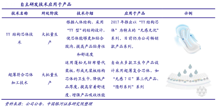 經(jīng)典案例:根據(jù)公司公告、中國銀河證券研究院等綜合資訊表明,百亞股份公司繼蘇菲之后第二個(gè)推出褲型衛(wèi)生巾,新推 出的無感七日系列第三代升級產(chǎn)品,厚度從 0.1cm 壓縮至 0.07cm,柔軟度增加 30%,進(jìn)一步 提升產(chǎn)品的舒適性。過去 10 年,其推出了 10 余款系列新產(chǎn)品,新品迭代速度較快,能力強(qiáng)。自主研發(fā)技術(shù)廣泛應(yīng)用于產(chǎn)品。