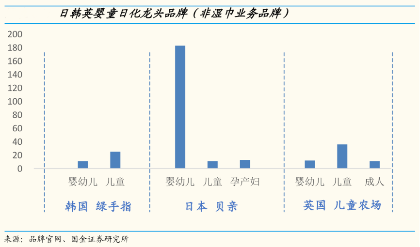 經(jīng)典案例:根據(jù)品牌官網(wǎng)、國(guó)金證券研究所等綜合資訊表明,英國(guó)頭部品牌兒童農(nóng)場(chǎng)在嬰幼童有機(jī)成分的品牌形象上、已推出成人線;韓國(guó)綠手指產(chǎn)品線深度覆蓋嬰幼兒及兒童日化領(lǐng)域全方位,有針對(duì)嬰幼兒的護(hù)膚及防曬、兒童高保濕系列及戶外系列;日本貝親以嬰幼兒為主,SKU較多,此外還有少量的兒童、孕產(chǎn)婦護(hù)膚系列;全球龍頭品牌強(qiáng)生嬰兒明星產(chǎn)品強(qiáng)生嬰兒沐浴露也廣泛被用于成人沐浴。