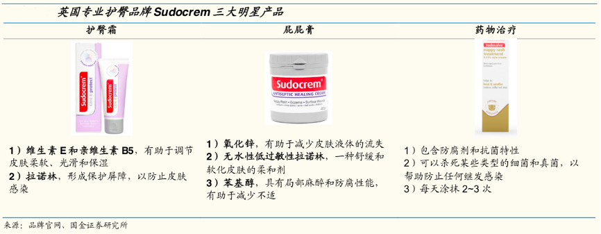 經(jīng)典案例:根據(jù)品牌官網(wǎng)、國(guó)金證券研究所等綜合資訊表明,Sudocrem為英國(guó)專業(yè)護(hù)臀品牌,其品牌創(chuàng)立于1931 年、具有 90 多年的歷史,品牌三大明星產(chǎn)品——預(yù)防尿布疹的護(hù)臀霜、治療/緩解尿布疹的屁屁膏、針對(duì)更加嚴(yán)重已潰破或發(fā)炎的藥膏。其憑借三大產(chǎn)品實(shí)現(xiàn) 20 年在英國(guó)嬰童日化行業(yè)約 1.2 億元人民幣、市占率4.6%。