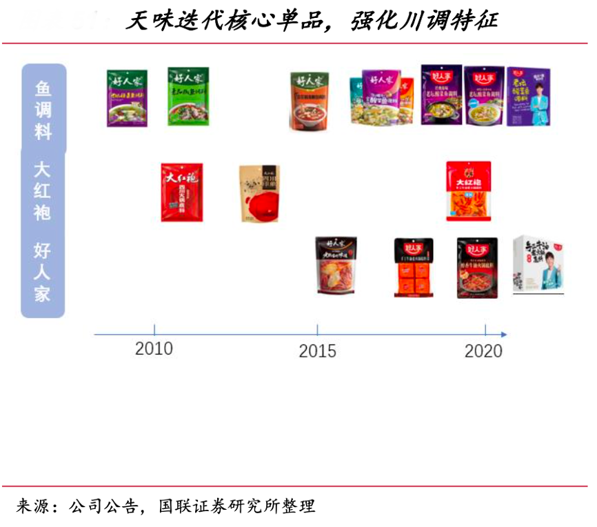 經典案例:根據公司公告、國聯證券研究所等綜合資訊表明,天味主要圍繞多款核心大單品進行升級迭代,不斷強化產品力,同時也在不斷強化公司川味復調料的品牌特性。其中,其大單品魚調料自 2009 年起在 12 年間 經歷近 7 次口味或包裝迭代,兩大子品牌的火鍋底料也各自進行了 3-4 次產品更新。