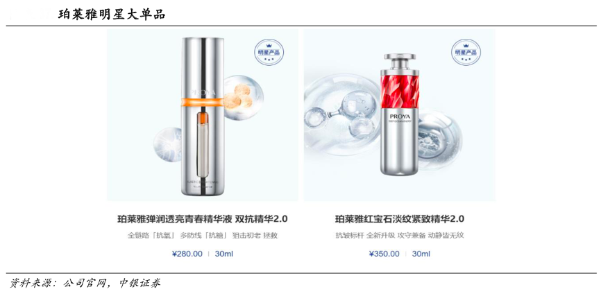 經(jīng)典案例:根據(jù)公司官網(wǎng)、中銀證券等綜合資訊表明,2019年珀萊雅品牌打造爆品黑海鹽泡泡面膜,主打深層清潔和保濕,并在天貓旗艦店月銷超 100 萬盒,破天貓美妝歷史;在獲得較高品牌關注度后,其緊接著于 2020 年推出復配抗老界兩大靈魂分子(1%超分子維A醇、20%的超高濃度六勝肽)的紅寶石精華和內(nèi)含獨有核心抗初老成分的雙抗精華,迅速成為公司的兩大明星單品。
