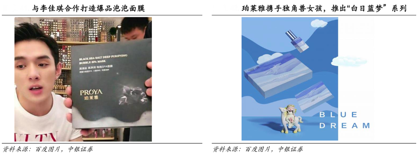 經(jīng)典案例:根據(jù)百度圖片、中銀證券等綜合資訊表明,2018年珀萊雅以前多采用廣告代言人(包括宋仲基、李易峰、羅云熙等)和電視劇/綜藝(冠名《夢想的聲音》等)宣傳;2018年以后不僅延續(xù)過往明星代言和電視劇/綜藝廣告贊助等宣傳模式,還布局內(nèi)容端營銷,與微博、抖音、KOL等進行深度合作,2019 年泡泡面膜的爆紅與該模式密不可分;此外其還通過直播等方式與用戶保持互動,增強用戶對品牌的粘性與忠誠度。