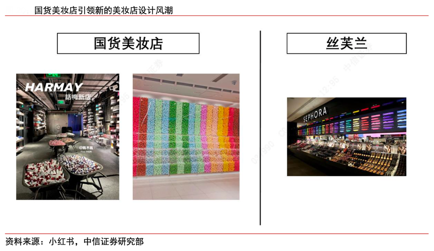 經典案例:根據小紅書、中信證券研究部等綜合資訊表明,在美妝店領域,過去消費者對美妝店的印象更多是像絲芙蘭這類品類較全、能夠試妝的門店,而 近年來如話梅、喜燃等新國貨美妝店的出現,通過更有特色的裝修(工業風、彩虹墻等) 和 KOL 的宣傳,把美妝店變成一個除了購買、試妝外,還能打卡曬照的場景,重新定義了美妝店的審美。
