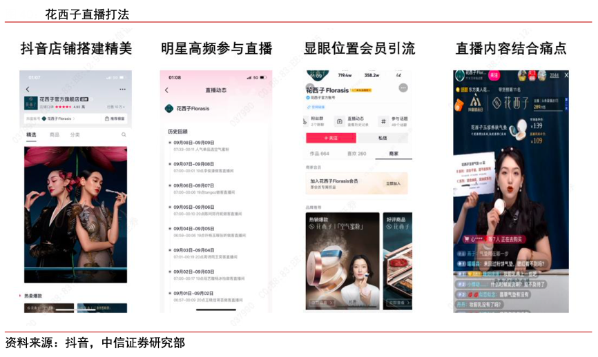 經典案例:根據抖音、中信證券研究部等綜合資訊表明,花西子誕生于 2017 年,定位“古風+ 東方元素”,其在淘寶直播、抖音、快手、B 站實現直播全域布局,實現精準的流量積累, 再通過社群運營提升復購。2020年伴隨抖音電商的崛起,花西子入駐抖音,通過精美的店鋪搭建,豐富的直播內容和營銷,以及積極的會員引流和社群運營,花西子在抖音渠道迅速崛起,截至 2021 年 9 月 8 日,粉絲量達 358 萬,位列抖音美妝品牌第二名(第一名是完美日記),銷售額長期位列抖音美妝品牌前三。