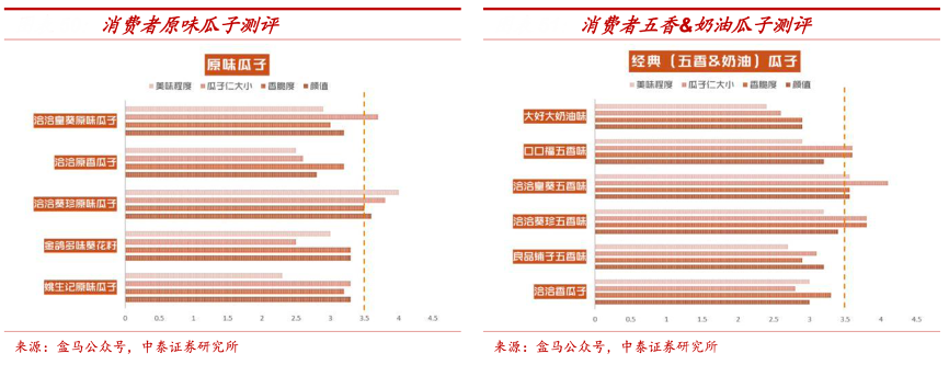 經(jīng)典案例:根據(jù)盒馬公眾號、中泰證券研究所等綜合資訊表明,在綜合考慮包裝美觀度、香脆度、瓜子仁飽 滿度、美味程度的前提下,洽洽在原味瓜子、五香/奶油瓜子、南瓜子、西瓜子等品類上都具備明顯優(yōu)勢。