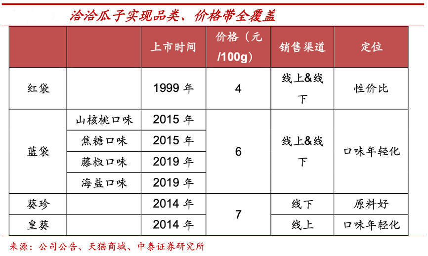 經(jīng)典案例:根據(jù)公司公告、天貓商城、中泰證券研究所等綜合資訊表明,洽洽瓜子基本實現(xiàn)了包裝瓜子品類、價格帶的全覆蓋。傳統(tǒng)紅袋 4 元/100g,主打線下渠道;藍(lán)袋、藤椒瓜子迎合年輕消費者口味,均價 6 元/100g,覆蓋線上、線下渠道,成為洽洽瓜子品類新增長點;皇葵、葵珍系列瞄準(zhǔn)高端,強調(diào)品質(zhì),拉動瓜子品類毛利率提升,均價約 7 元/100g,前者主打線上,后者覆蓋線下。