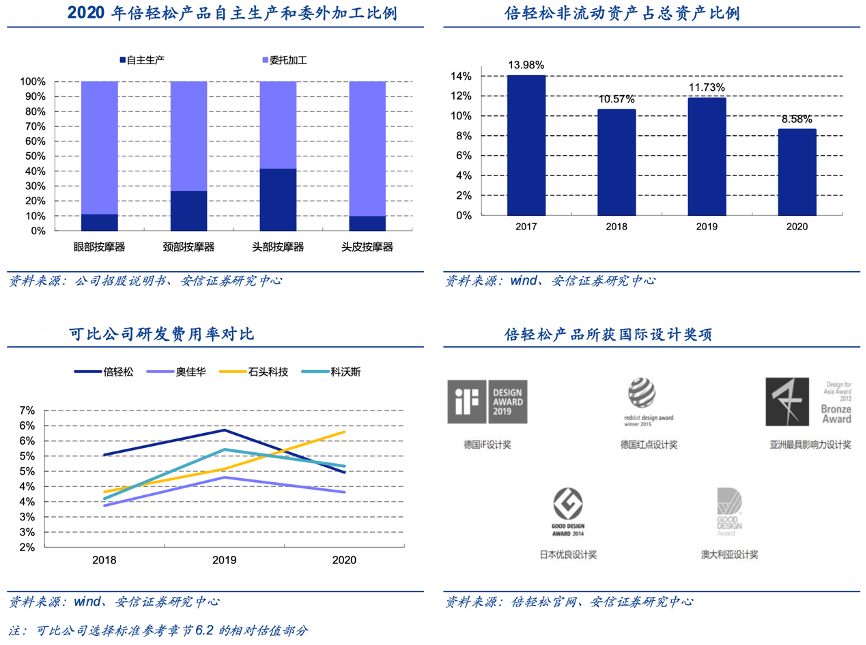 經典案例:根據wind、倍輕松官網、公司招股說明書、安信證券研究中心等綜合資訊表明,近幾年,倍輕松公司的研發費用率明顯高于可比公司,顯示出公司對研發環節的重視。其產品能以輕巧便攜的形態實現模擬人手的按揉效果。憑借優良的工業設計,獲得境內外重要獎項十余項,包括德國紅點設計獎、德國 iF 設計獎、日本優良設計獎、澳大利亞優良設計獎、香港工商業獎、中國外觀設計銀獎、中國外觀設計優秀獎等。