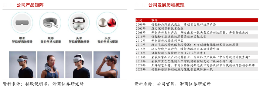 經典方法:根據招股說明書、公司官網、浙商證券研究所等綜合資訊表明,倍輕松成立于2000年,是一家專注于健康產品創新研發的高新技術企業,主要從事智能便攜按摩器的設計、研發、生產、銷售及服務。其曾在行業內首創眼部與頭部按摩器品類產品,此后不斷橫向拓展頭部、頭皮、足部等按摩產品。其 產品銷售以自主品牌“breo”和“倍輕松”系列產品為主,同時還為其他知名品牌企業提供 ODM 定制產品。
