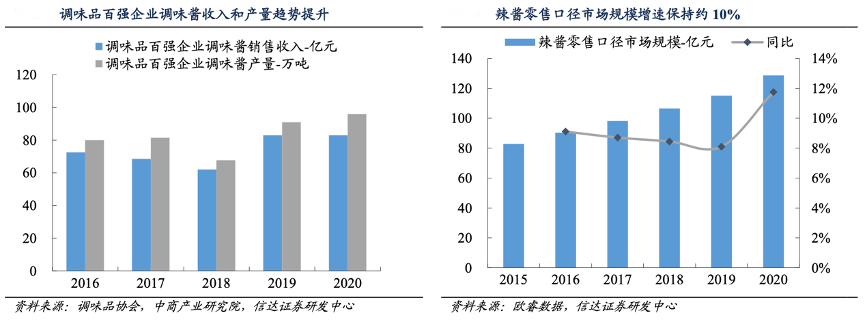 經典案例:根據歐睿數據、調味品協會、中商產業研究院和信達證券研發中心等綜合資訊表明,2020年調味品頭部企業收入占比 31%;產量合計 96 萬噸,頭部企業產量占比 30%。辣醬是調味醬重要的品類,根據歐睿數據,2020 年辣醬零售口徑市場規模為 128.7 億元,15-20 年市場規模復合增速為 9.2%。海天主打黃豆醬,利用渠道優勢迅速打開 市場銷路,海天黃豆醬已成為銷售額超過 10 億元的大單品。