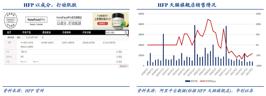 經典案例:根據HFP官網、阿里平臺數據等綜合資訊表明,進入微信公眾號、小紅書的內容營銷時代后,2016年8月,成分黨代表品牌 HFP 入駐天 貓,開啟了三年多的高速增長,也引領著新一波成分黨潮流,主打成分足且價格低。2017年銷售額達到 3.6 億元,2018年達到大約 10 億量級。