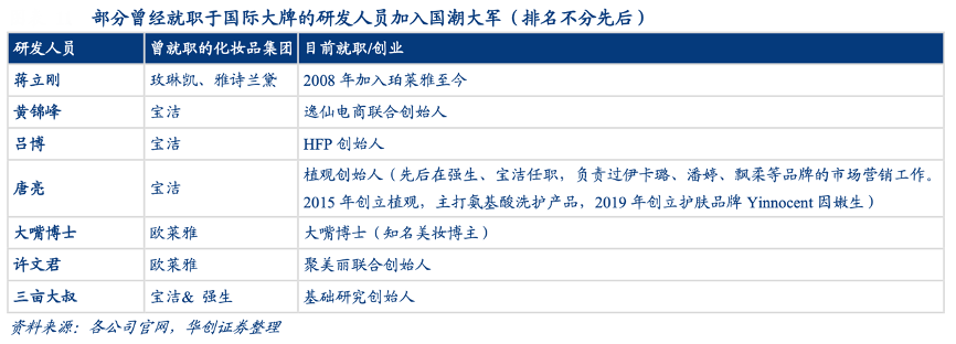 經典案例:根據各公司官網、華創證券等綜合資訊表明,隨著國力提升、國潮崛起,新一代消費者對國產品牌、國產產品實力的認同感顯著提高,有一批曾經就職于國際大牌的研發人員加入國潮大軍,或直接就任國產品牌,或創立新品牌,或投身產業鏈建設、或作為相關咨詢顧問等等,推動國產品牌的進步。