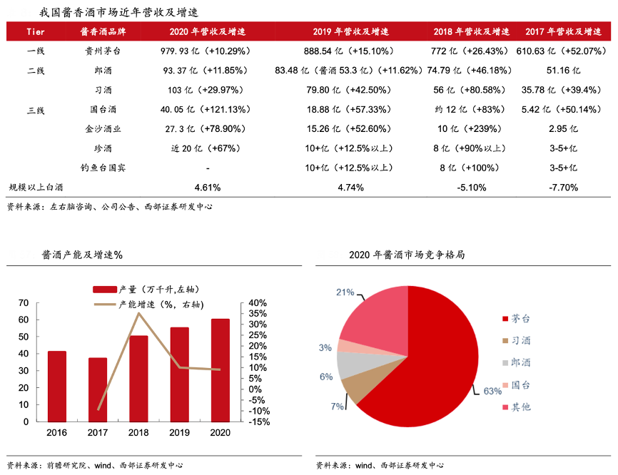 經(jīng)典案例:根據(jù)左右腦咨詢、公司公告、前瞻研究院、wind、西部證券研發(fā)中心等綜合資訊表明,從競(jìng)爭(zhēng)格局來看,茅臺(tái)作為超高端醬香鼻祖,2020年?duì)I收占比醬酒行業(yè) 63%,地位穩(wěn)固。在近年來茅臺(tái)直營(yíng)放量及非標(biāo)提價(jià)的持續(xù)推進(jìn)下,下游醬香酒企加速打開量?jī)r(jià)空間,以郎酒、習(xí)酒為代表的百億級(jí)品牌,2020 年至今針對(duì)紅花郎/青花郎、窖藏系列等核心單品均有提價(jià)行為落地,以國(guó)臺(tái)、金沙為代表的 50 億規(guī)模內(nèi)酒企,2020 年以來也有10-20%左右幅度的價(jià)格變動(dòng)。
