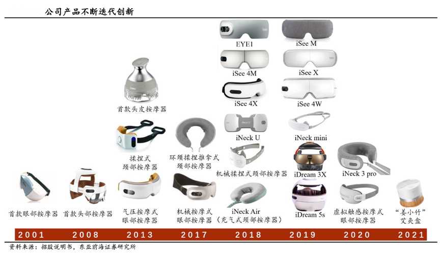 經典案例:根據天貓旗艦店、東亞前海證券研究所等綜合資訊表明,目前倍輕松公司主要產品覆蓋 眼部、頸部、頭部、頭皮等主流部位,其他部位也有產品銷售,2021年其還新推出了智能艾灸盒產品“姜小竹 A1”,產品布局進一步延伸至中醫個護。每一個核心品類均有多個 SKU,滿足消費者多元化消費需求。如眼部按摩器有氣壓按摩式、機械按摩式和虛擬觸感按摩式三種類型等。