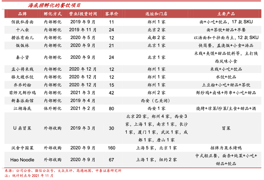 經(jīng)典案例:根據(jù)公司公告、微信公眾號(hào)、大眾點(diǎn)評(píng)、高德地圖、中泰證券研究所等綜合資訊表明,近年來,海底撈不斷根據(jù)市場走向,圍繞行業(yè)趨勢、產(chǎn)品趨勢,切入熱門賽道,搶占市場流量。2019 年下半年以來,海底撈連續(xù)推出了秦小賢、撈派有面兒、十八汆、佰麩私房面、孟小將、駱大嫂、飯飯林、制茶樂園、喬喬的粉、苗師兄鮮炒雞等多個(gè)子品牌。2020 年底,海底撈在北京開出了首家火鍋食材超市。海底撈經(jīng)過多年沉淀目前已經(jīng)形成了縱向一體化的餐飲供應(yīng)鏈產(chǎn)業(yè)集團(tuán),依托其現(xiàn)有的供應(yīng)鏈集成能力進(jìn)行快餐品類的品牌集群孵化。