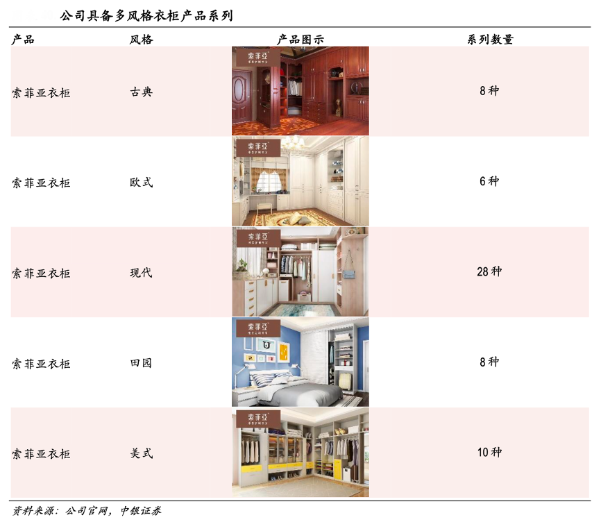 經典案例:根據公司官網、中銀證券等綜合資訊表明,索菲亞公司深耕衣柜業(yè)務多年,并在行業(yè)內首創(chuàng)定制衣柜概念,將定制的個性化和成品衣柜的規(guī)模化優(yōu)勢相結合。其衣柜風格結合了浪漫經典的歐洲藝術和中國現(xiàn)代生活藝術,引領了時尚潮流,并推出雙飾面、烤漆、實木等不同材質的衣柜產品覆蓋不同消費能力的消費者。2020年其衣柜業(yè)務收入為 67.0 億元,近 5 年復合增長率為 16.9%,衣柜收入規(guī)模位于行業(yè)第一。