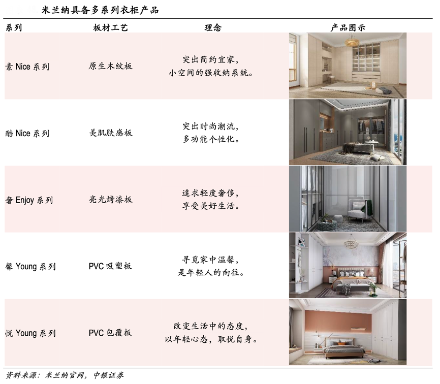 經典案例:根據米蘭納官網、中銀證券等綜合資訊表明,由于索菲亞衣柜定位中高端市場,較難覆蓋到大量大眾消費群體。2021 年 3 月,其公司正式發(fā)布性價比品牌米蘭納以開拓增量市場,米蘭納產品工藝以平板和吸塑為主,與索菲亞產品特點形成較大差異,并有望依托索菲亞強大品牌力與供應鏈迅速拓展 低價格段市場。截至2021 年 H1,米蘭納已發(fā)展經銷商 214 家,專賣店 32 家。