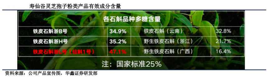經典案例:根據公司產品宣傳圖、華鑫證券研究部等綜合資訊表明,壽仙谷公司自主選育出“仙斛 1 號”、“仙斛 2 號”和“仙斛 3 號”,具有抗逆性強、有 效成分高的特點。鐵皮石斛的主要功效成分為粗多糖,經過太空選育的“仙斛 1 號”粗多糖含量高達 47.1%,為藥典標準的 1.88 倍。