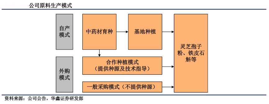 經典案例:根據公司公告、華鑫證券研究部等綜合資訊表明,白姆鄉和俞源鄉的中藥材種植基地面積接近 1500 畝,為壽仙谷公司生產靈芝孢子粉、 鐵皮石斛等下游產品提供充足的原料保證。其采取以銷定產方式,原材料以基地自 產模式為主。除了基地自產模式之外,還有小部分原材料通過外購模式獲得。外購模式分為兩種,一種為合作種植模式,即公司與特定農戶簽訂合同,向其免費提供菌種、種苗和技術指導,種植所得產品經驗收合格后全數回購;另一種為一般采購模式,即以市場價格收購符合公司質量標準的原材料。外購模式中以合作種植為主。