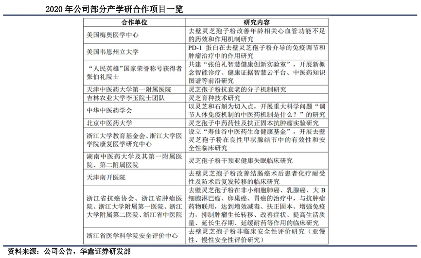經典案例:根據公司公告、華鑫證券研究部等綜合資訊表明,2021上半年,壽仙谷公司新簽訂產學研合作開發合同 14 項,目前在研產學研合作開發 項目共計 45 項。通過與高校、研究所等科研機構的合作,其不斷探索靈芝等多種產品的藥用價值和保健功效。