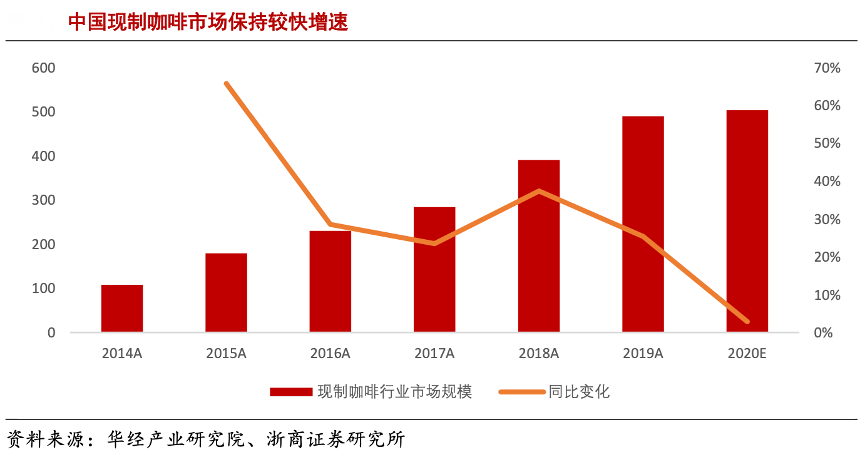 經(jīng)典案例:根據(jù)華經(jīng)產(chǎn)業(yè)研究院、浙商證券研究所等綜合資訊表明,中國大陸咖啡市場,特別是現(xiàn)制咖啡市場發(fā)展時間較短,仍處于市場規(guī)模快速增長和消費(fèi)習(xí)慣養(yǎng)成階段。根據(jù)華經(jīng)產(chǎn)業(yè)研究院數(shù)據(jù),中國大陸現(xiàn)制咖啡市場規(guī)模近年來保持 20%以上年增速,2019 年達(dá)到 489 億元。2020年受疫情影響,增速放緩,約為 503 億元。