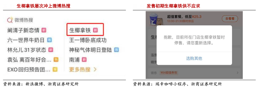 經(jīng)典案例:根據(jù)新浪微博、瑞幸咖啡小程序、浙商證券研究所等綜合資訊表明,新式咖啡采用桂花等果味糖漿、冷萃等新型技術(shù)以及巧克力、燕麥奶等新 型添加劑,口味新穎且更加吸引年輕人。例如,瑞幸于 2021 年夏天推出的生椰拿鐵便成為“爆款”,6 月單月銷量超過 1000 萬杯。事實(shí)上,瑞幸自 2019 年以來每年都有“爆款”出現(xiàn),2019 年為隕石拿鐵,2020 年 為厚乳拿鐵,這些“爆款”都保留在產(chǎn)品線中,成為銷量主力。