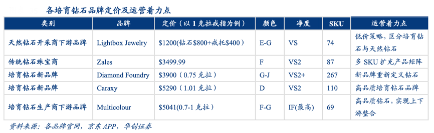 經典案例:根據各品牌官網、京東APP、華創證券等綜合資訊表明,下游培育鉆石品牌分為四大類:一是天然鉆石開采商;二是傳統鉆石珠寶商(培 育鉆石品牌/產品系列),三是新興的培育鉆石品牌商,四是培育鉆石生產商布局下游。同時根據不同培育鉆石品牌的定價策略與運營著力點不同,天然鉆生產商多采用低價策略,品牌商采用重新定義鉆石產品、多 SKU 豐富產品矩陣的策略,培育鉆石生產商尋求上下游產業整合。