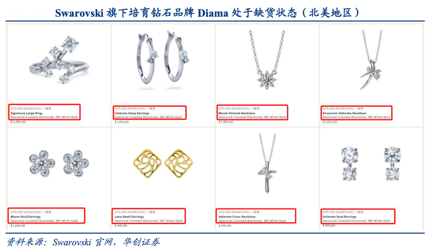經典案例:根據Swarovski官網、華創證券等綜合資訊表明,施華洛世奇通過高端定位+豐富產品矩陣布局。施華洛世奇涉足培育鉆石市場的時間較早,其 在 2016 年 5 月創建了培育鉆石品牌 Diama,品牌使用培育鉆石,2018 年 7 月,將 Diama 從寶石部門調整至奢侈品部門(Atelier Swarovski),標志著公司把該品牌戰略重心定位在高端奢侈品領域。目前在中國地區的官網上尚未上線 Diama,在北美地區官網上線的 Diama 處于缺貨狀態。