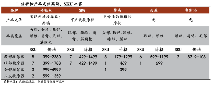 經(jīng)典案例:根據(jù)天貓旗艦店、東亞前海證券研究所等綜合資訊表明,目前倍輕松公司主要產(chǎn)品覆蓋眼部、頸部、頭部、頭皮等主流部位,其他部位也有產(chǎn)品銷售,2021年其還新推出了智能艾灸盒產(chǎn)品“姜小竹A1”,產(chǎn)品布局進(jìn)一步延伸至中醫(yī)個(gè)護(hù)。每一個(gè)核心品類均有多個(gè) SKU,滿足消費(fèi)者多元化消費(fèi)需求。如眼部按摩器 有氣壓按摩式、機(jī)械按摩式和虛擬觸感按摩式三種類型。
