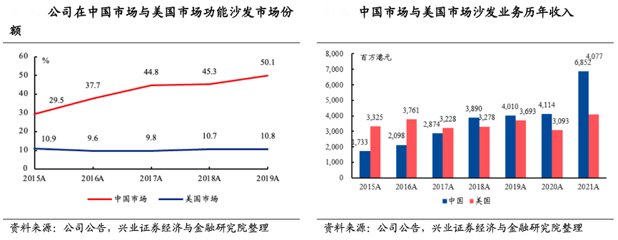 經(jīng)典案例:根據(jù)公司公告、興業(yè)證券經(jīng)濟(jì)與金融研究院等綜合資訊表明,敏華控股公司多年來在中國市場保持領(lǐng)先地位,市占率從 2015 年的 29.5%提升至 2019 年的 50.1%,已然是中國功能沙發(fā)的絕對龍頭。其在美國功能沙發(fā)競爭格局逐步分散的環(huán)境下市占率多年來維持在10%左右的水平。其亦多年來保持在美國家具市場前十大供貨商的地 位。