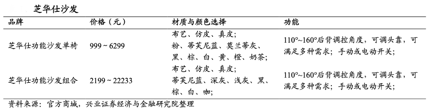 經典案例:根據官方商城、興業證券經濟與金融研究院等綜合資訊表明,隨著消費者群體年齡的降低,敏華推出更 多針對年輕群體的單椅功能沙發。相比于傳統一般的功能沙發,新推出的單椅沙發銷售單價更低,占空間小,組合性強。顏色也從傳統的黑、棕、灰和白色擴張 至粉、藍、綠等顏色。單椅新品的推出更好地滿足了年輕客戶對于價格、空間和搭配的需求。