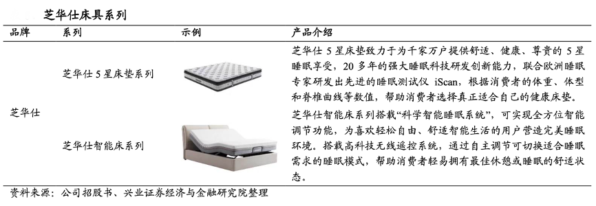經典案例:根據公司招股書、興業證券經濟與金融研究院等綜合資訊表明,敏華控股公司依托于國內外領先的沙發制造與銷售商地位,其芝華仕品牌旗下有 5 星床墊系列以及智能床 系列。其旗下 NICOLETTIHOME 尼科萊蒂以及名華軒品牌亦會提供相關的床具產品。