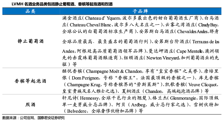 經典案例:根據公司官網、國泰君安證券研究等綜合資訊表明,LVMH集團在高端葡萄酒與烈酒領域在全球居于領導地位。酩悅軒尼詩擁有悠久的品牌歷史,酩悅香檳由酒商克勞德·酩悅于1743年創立,軒尼詩由愛爾蘭裔退役軍人理察·軒尼詩于1765年創立,酩悅香檳于 1971年與軒尼詩干邑合并,組成酩悅軒尼詩集團。名酒業務品類包括靜止葡萄酒、香檳等起泡酒和烈酒,核心品牌包括酩悅香檳、唐培里儂和干邑軒尼詩,此外還有庫克香檳、凱歌香檳等23個子品牌。