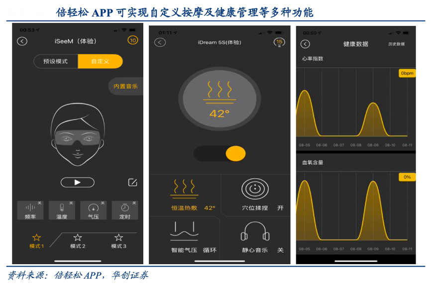 經(jīng)典案例:根據(jù)倍輕松APP、華創(chuàng)證券等綜合資訊表明,倍輕松用戶可通過手機(jī)等移動(dòng)終端設(shè)備與按摩器相連接,監(jiān)測(cè)和管理個(gè)人健康狀況,并進(jìn)行溫度調(diào)節(jié)、按摩程式設(shè)計(jì)等自定義設(shè)置,同時(shí)還能 DIY 按摩組合。同時(shí)其在大數(shù)據(jù)分析的輔助下為用戶提供更豐富的健康服務(wù),如遠(yuǎn)程推送更適合的按摩程式。但當(dāng)前該技術(shù)研發(fā)應(yīng)用有限,除倍輕松 APP 外其他技術(shù)仍處研發(fā)階段。