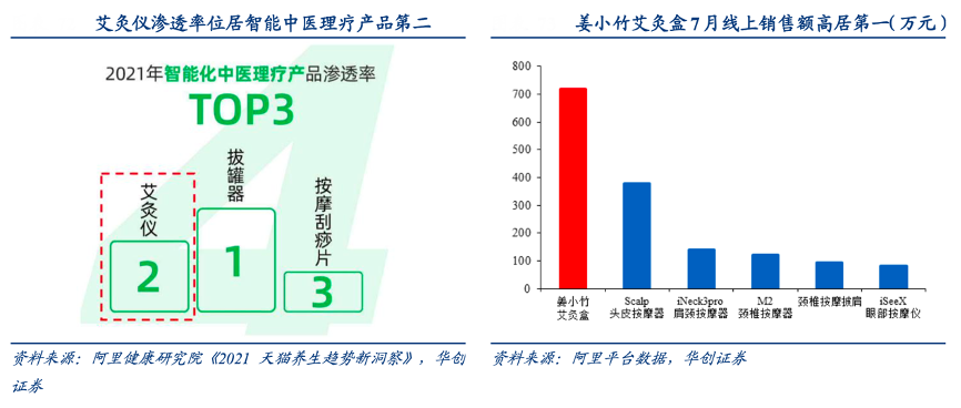經(jīng)典案例:根據(jù)阿里健康研究院、阿里平臺(tái)數(shù)據(jù)、華創(chuàng)證券等綜合資訊表明,除眼部、頸部、頭部等現(xiàn)有主流產(chǎn)品外,倍輕松公司還在積極拓展新的產(chǎn)品矩陣以觸達(dá)更多消費(fèi)人群。根據(jù)阿里健康研究院的數(shù)據(jù)顯示,在智能化中醫(yī)醫(yī)療產(chǎn)品中艾灸儀的滲透率高居第二,而倍輕松推出的“智能艾灸盒”采用真明火懸灸,燃燒釋放的有益微量元素可被人體吸收,7月銷售額達(dá)到 717.8 萬元,超過第二名約90%,位居公司 SKU 線上收入之首。