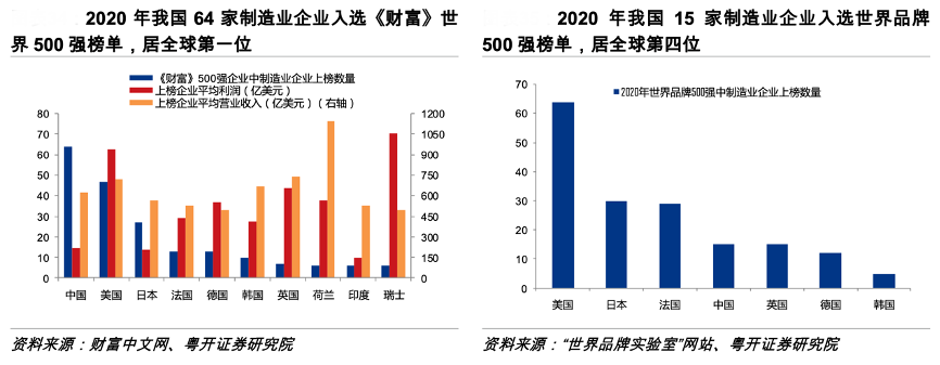 經(jīng)典案例:根據(jù)財(cái)富中文網(wǎng)、“世界品牌實(shí)驗(yàn)室”網(wǎng)站、粵開證券研究院等綜合資訊表明,從企業(yè)規(guī)模看,2020年我國(guó)共有 64 家制造業(yè)企業(yè)入選《財(cái)富》世界 500 強(qiáng)榜單, 位列世界第一。我國(guó)上榜制造業(yè)企業(yè)平均營(yíng)業(yè)收入為622 億美元,與全部上榜制造業(yè)企 業(yè)平均值大致相當(dāng)。從知名品牌看,2020 年我國(guó)有 15 家制造業(yè)企業(yè)入選世界品牌 500 強(qiáng),數(shù)量名列全 球第四,品牌影響力弱于數(shù)量。美國(guó)擁有 64 個(gè)制造業(yè)世界知名品牌,集中在食品、電子 和汽車領(lǐng)域。日本、法國(guó)分別擁有 30 個(gè)和 29 個(gè),分別集中在汽車和機(jī)械、奢侈品領(lǐng)域。