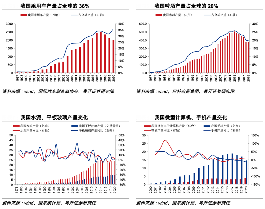 經(jīng)典案例:根據(jù)wind、國(guó)際汽車制造商協(xié)會(huì)、巴特哈斯集團(tuán)、粵開證券研究院等綜合資訊表明,我國(guó)各類工業(yè)品產(chǎn)量大幅增長(zhǎng),220多種工業(yè)產(chǎn)品產(chǎn)量位居世界首位。原材料類工業(yè)品產(chǎn)量增長(zhǎng)對(duì)工業(yè)化建設(shè)形成保障,如我國(guó)粗鋼產(chǎn)量已達(dá)到 100 萬(wàn)噸量級(jí),占全球粗 鋼產(chǎn)量比重達(dá) 53%,鋁冶煉產(chǎn)量占全球的 57%,水泥、平板玻璃等產(chǎn)品產(chǎn)量大幅提升。 消費(fèi)類工業(yè)品產(chǎn)量增長(zhǎng)積極滿足國(guó)內(nèi)外市場(chǎng)需求,如我國(guó)乘用車產(chǎn)量已達(dá)到全球的 36%, 計(jì)算機(jī)、手機(jī)等產(chǎn)品產(chǎn)量大幅上升。