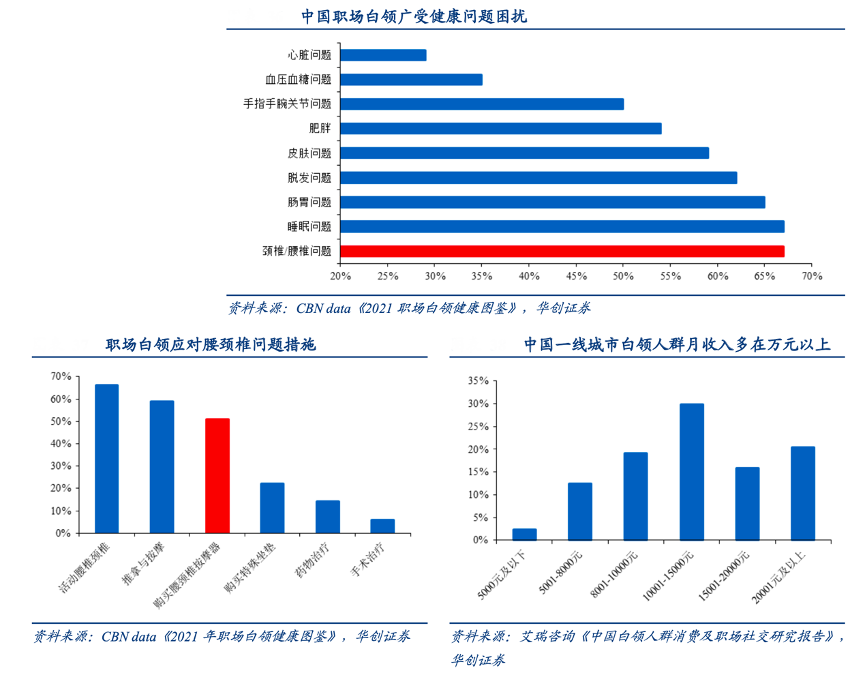經典案例:根據CBN data《2021年職場白領健康圖鑒》、華創(chuàng)證券、艾瑞咨詢《中國白領人群消費及職場社交研究報告》等綜合資訊表明,在白領中腰椎/頸椎問題最為常見,比重達到 67%,是與睡眠問題并列的最普遍職場健康問題。