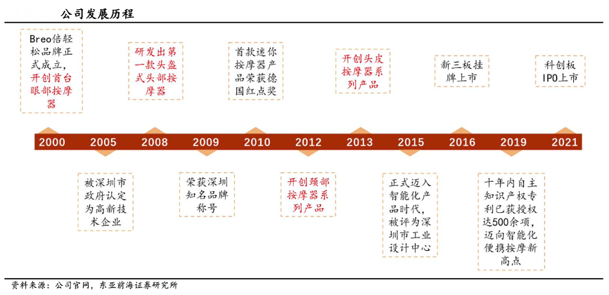 經典案例:根據公司官網、東亞前海證券研究所等綜合資訊表明,倍輕松成立于 2000 年,專注于健康產品創新研發,2000年其攜首款眼部按摩器產品進入按摩器具行業之后,不斷擴充產品體系,分別于 2008 年、 2012 年、2013 年推出首款頭部、頸部、頭皮智能便攜按摩器,并于 2021 年成功登錄科創板上市。